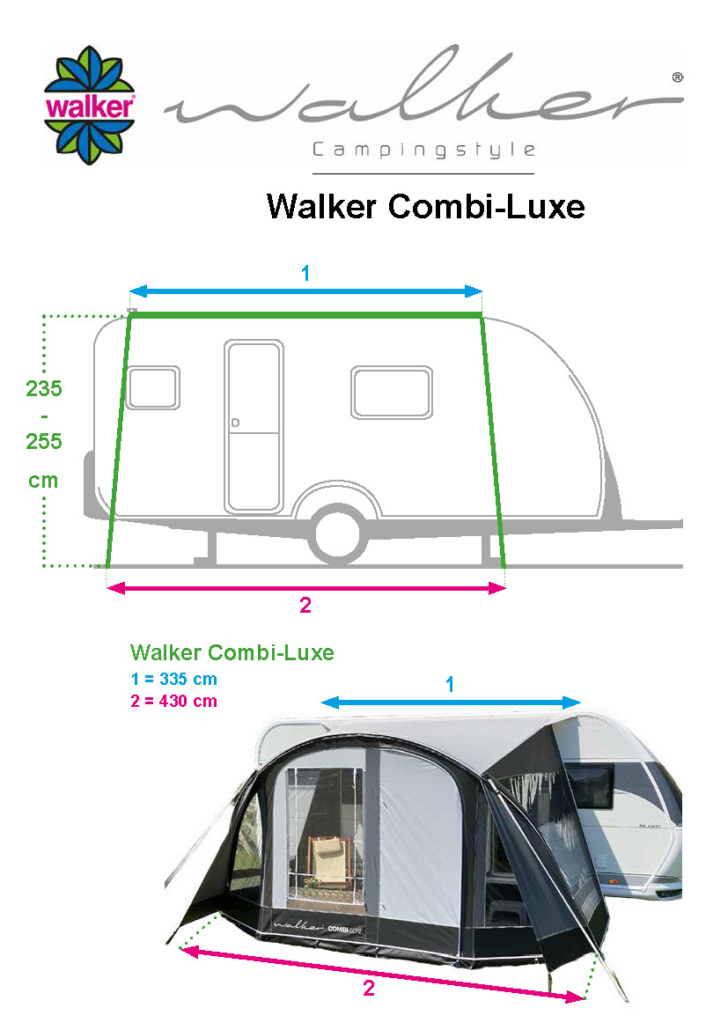 Walker COMBI-LUXE har en monteringshøjde på 235-255 cm og kræver en teltskinne med et lige stykke på minimum 335 cm.
